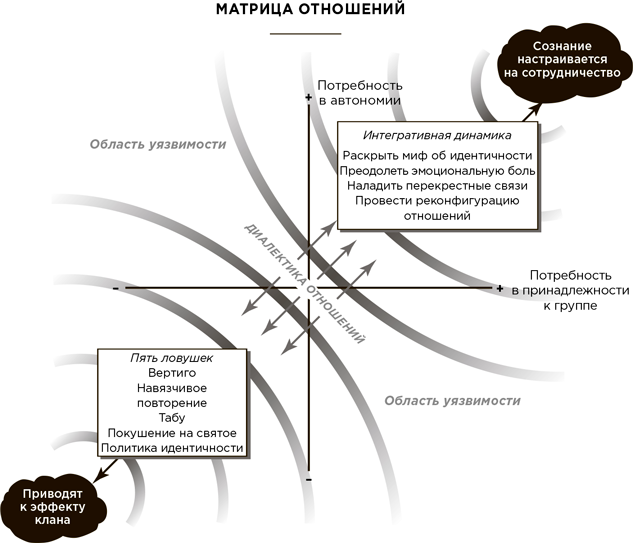 Матрица иллюстрирует, как пять ловушек кланового мышления подводят вас к эффекту клана, в то время как другой набор факторов – интегративная динамика – помогает выработать более конструктивный созидательный настрой. Если вы твердой рукой не проведете свой корабль в обход ловушек, они будут тянуть вас к эффекту клана, готовя вам ту же судьбу, что постигла моряков, не сумевших устоять перед песнями сирен.
