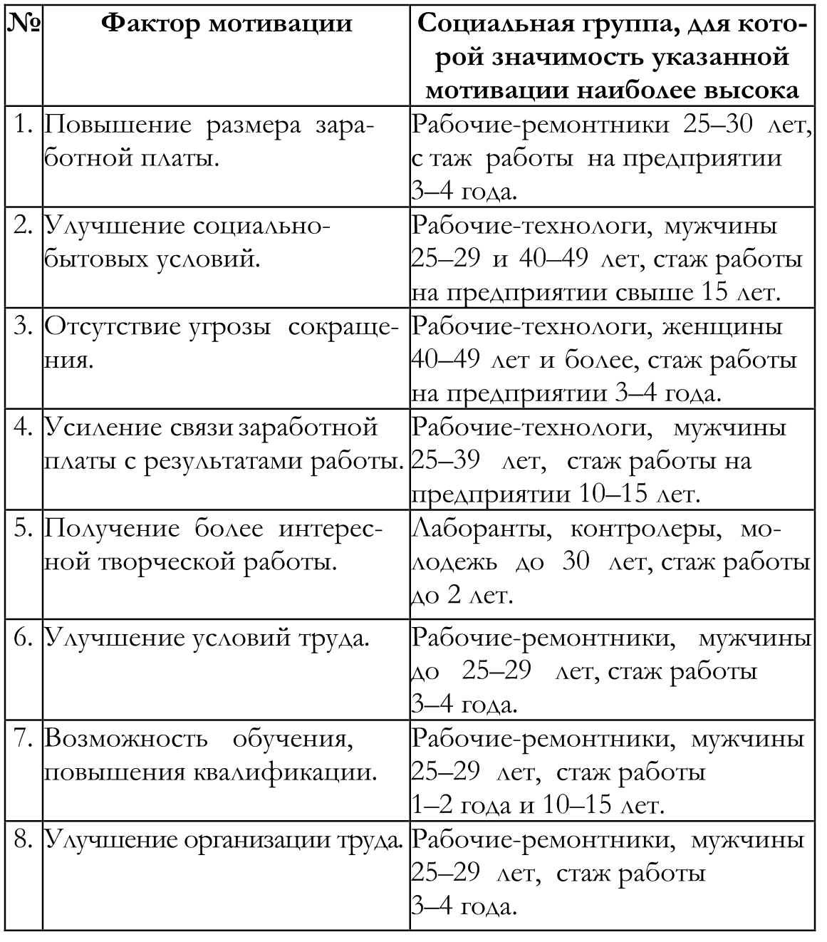 В исследованиях Т. Хлоповой7 изучалась мотивация работников, принадлежащих к разным социальным группам.