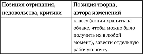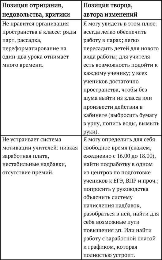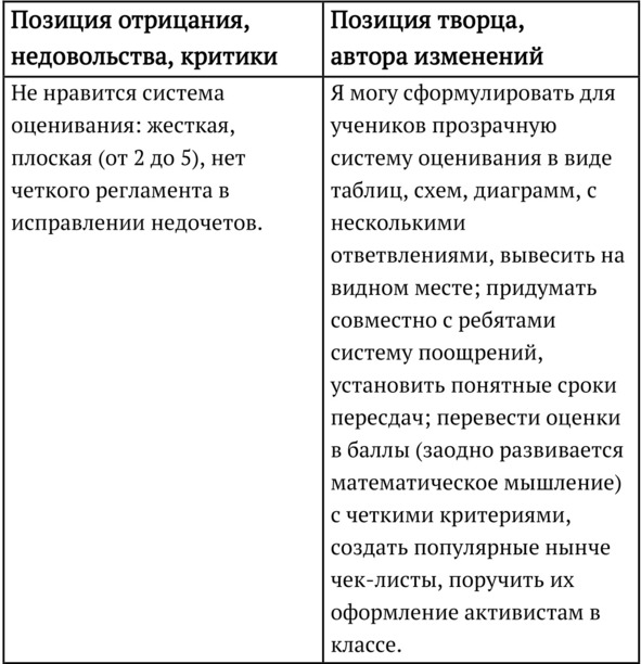 Точно так же по-разному можно формулировать вопросы и в профессиональной среде. Уверена, что многие из вас яростно желают что-то изменить в образовательном пространстве. Скажем, не нравится подход к оцениванию учеников, форматы и рамки уроков, образовательные программы, реформы и т. д. Сформулируйте те изменения, которые вы видите, в позитивном ключе и от первого лица.