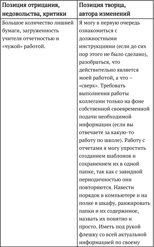 Эти этапы легко проследить в работе учителей: если педагогу приходится каждый вечер тратить силы на восстановление своего психоэмоционального состояния, если мысли о низкой зарплате не позволяют расслабиться, если администрация и родители держат в тонусе, то о каких благих намерениях мы говорим? Человеку нужно элементарно успокоиться, разобраться, расставить приоритеты, выделить время для отдыха, понять, что все возможно, уйти из позиции жертвы и начать получать удовольствие от происходящего. На это нужны силы и желание. В равной степени.