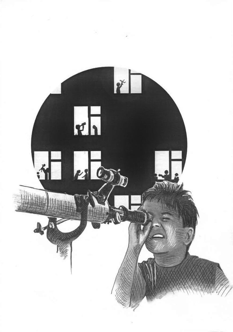 Семейство Сарыковых жило на четвертом этаже хрущевки по улице Терешковой 42; окна их квартиры аккурат выходили в том самый двор, который утром с мало присущей ему рассеянностью обозревал агент Смит. На часах было десять тридцать, когда Лачик установил телескоп на боевую позицию у окна своей комнаты. К этому времени почти все жители уже проснулись и беспечно сидели у себя дома с раздвинутыми настежь шторами. Утренние лучи солнца ярко светили прямо в окна, создавая прекрасное естественное освещение внутренностей квартир, окна которых выходили во двор Лачиковского дома. Ничего не подозревающие обитатели домов спокойно завтракали, смотрели телевизор, приводили себя в божеский вид перед зеркалом, ссорились или, наоборот, дружески общались между собой, совершенно при этом не ведая, что в это же самое время все они находятся под прицелом наружного наблюдения, которое в тайне от родителей и всех своих приятелей организовал Лачик Сарыков. Это занятие доставляло любознательному мальчику куда большее удовольствие, чем астрономия.