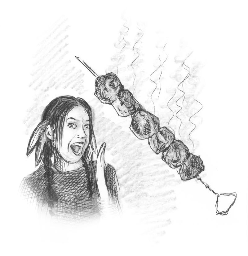 Мямлик без лишних разговоров достал из шляпы вертело, на котором были нанизаны большие куски изумительно пахнущего мяса с аппетитной поджаристой корочкой, обильно посыпанного кинзой и укропом.