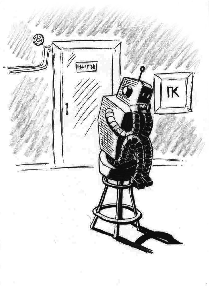 Дети через парадное крыльцо зашли в институт вслед за Данилой Андреевичем. На проходной стоял грустный робот. При виде изобретателя он немного оживился.