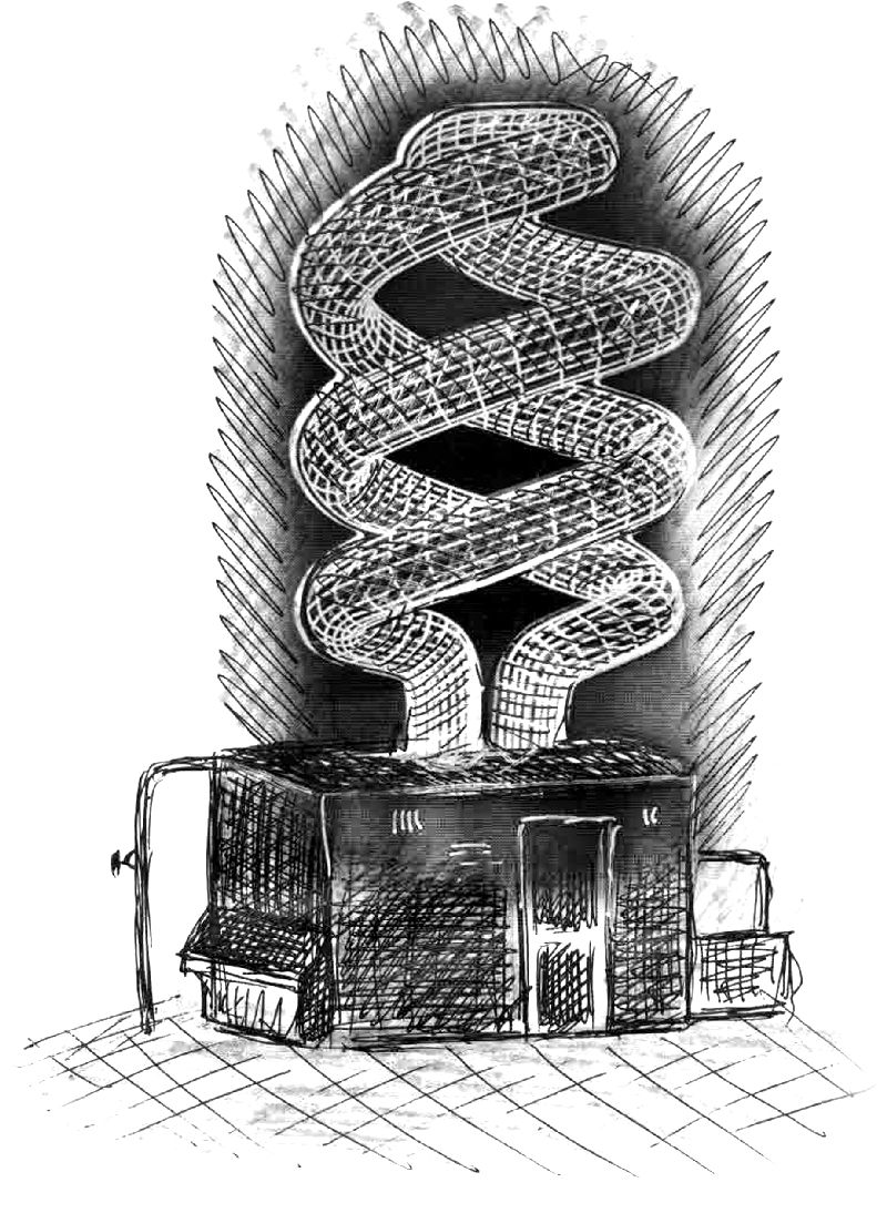 Изобретатель провел детей в свою лабораторию, посередине которой стояла высокая установка в виде вертикально расположенной спиралеобразной трубы из больших сваренных листов алюминия. Рядом на стойках стояли приборы, от которых к установке шли многочисленные провода. Дергались стрелки на аналоговых датчиках, зелеными и красными огоньками светились индикаторы, щелкали какие-то реле и ощутимо пахло озоном.