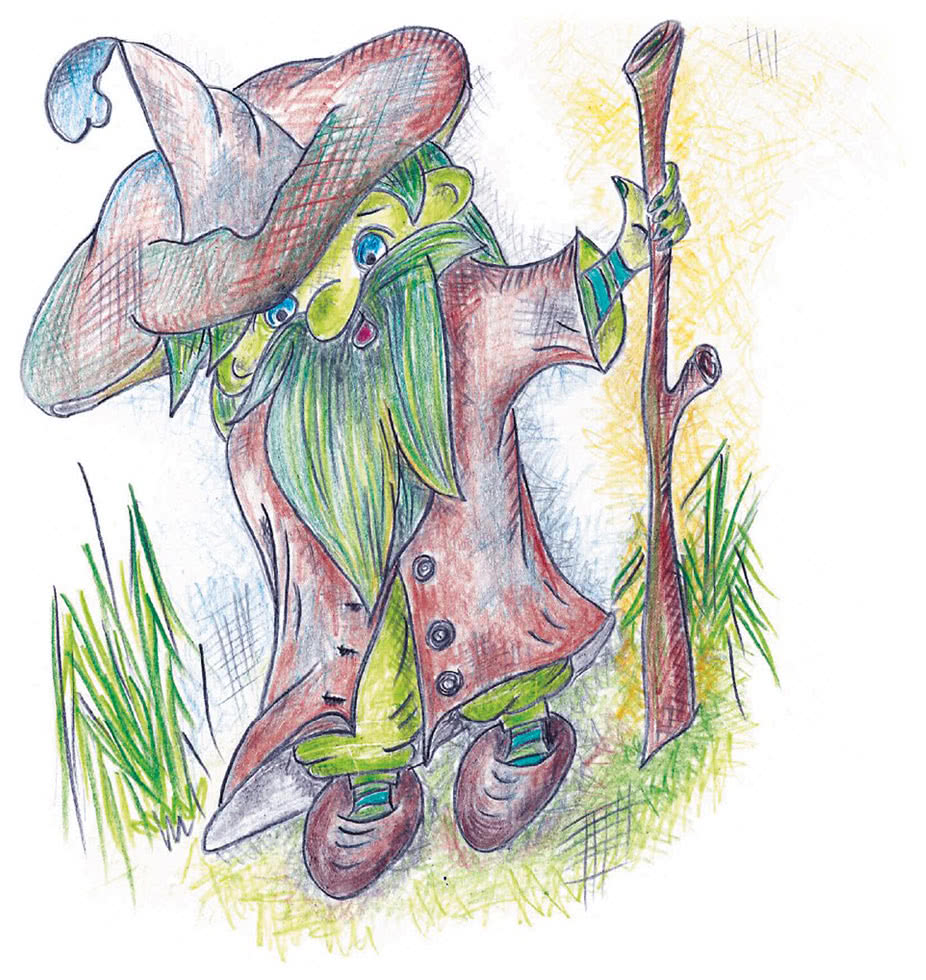 Ну а теперь пора вернуться в наш лес, где из-за кустов спелой красной малины появилась большая коричневая шляпа лесовика. Из его стареньких стоптанных башмаков торчали зелёные полосатые носки, а из-под плаща – тёплая кофточка в полоску такого же цвета. Он несколько раз довольно погладил свою бороду, потом заразительно улыбнулся и, временами шепелявя, поприветствовал меня: