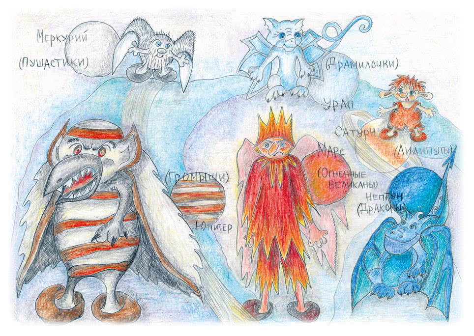 А на голубом Уране, получившем название в честь древнегреческого Бога неба, обустроили свои уютные пышные гнёзда из растущих на планете васильков нежно-голубые небесные драмилочки с необыч-ными хвостами и крыльями.