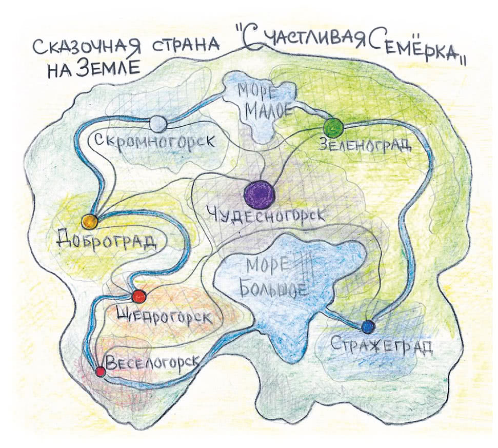 Страна Счастливая Семёрка, о которой я хочу вам рассказать, находится где-то рядом с нами, но нам не видна. А вы знали о том, что в нашем мире во все времена по разным причинам меняли названия городам? Вот и в этой стране произошло подобное. В неё входило семь городов: Веселогорск, Щедрогорск, Доброград, Зеленоград, Скромногорск, Стражеград, Чудесногорск. Добрею очень понравилась Счастливая Семёрка, поэтому старичок решил добавить в её жизнь что-нибудь новенькое лично от себя! Он изменил в названиях четырёх городов последний слог «горск». Теперь все они заканчивались на слог «град». Их похожее звучание радовало Добрея, и он очень гордился своим подарком!