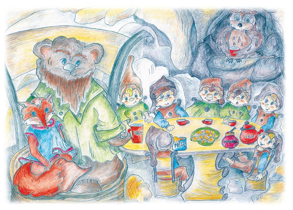 Как-то раз в пещеру к гномам пришли гости: дедушка Макс и Валериана. Сова Чуча Карловна уже хлопотала по хозяйству и накрывала на стол. Медведь спросил малышей: