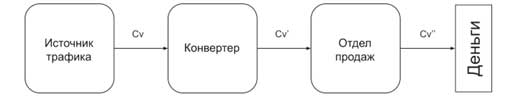 Аудитория переходит от одного блока системы к другому. Но на следующий блок переходят не все люди, часть «сливается». Где-то теряется 10 % людей, где-то – 50 %, а где-то и все 99 %. Эффективность перехода между блоками называется конверсией (обозначается Cv). А поскольку конверсия между блоками разная, то, чтобы их различать, часто в условном обозначении добавляют «штрих» (Cv’), «два штриха» (Cv’’) и т. д. Если источников много, то конверсии на схеме нумеруют, но об этом мы будем говорить более подробно в девятой главе.