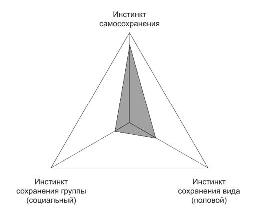Эти три инстинкта по факту и определяют поведение, образ жизни и мышления индивида. В каждом человеке есть все три инстинкта, но выражены они у разных людей в разной степени. Более того, они могут включаться или выключаться в зависимости от обстоятельств. Но всегда, как правило, есть какой-то один инстинкт, который доминирует и, по сути, определяет поведение, восприятие и тип мышления человека. Визуально это можно представить как на рисунке ниже.