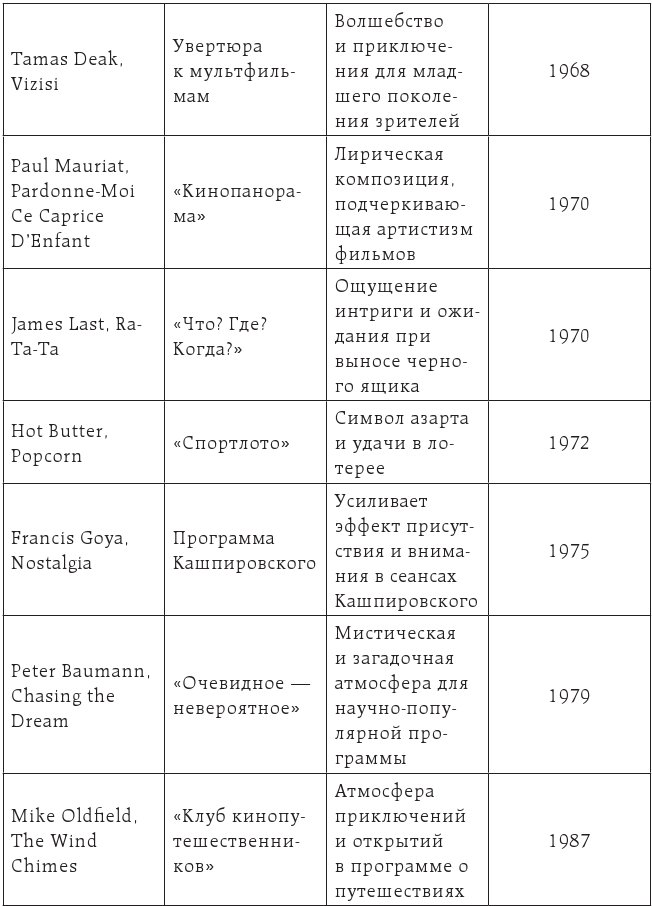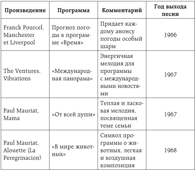 Иностранная музыка в советском телеэфире служила не только фоном для различных программ, но и во многом формировала атмосферу и эмоциональный отклик зрителей. Вот список некоторых самых запоминающихся музыкальных произведений и программ, в которых они использовались: