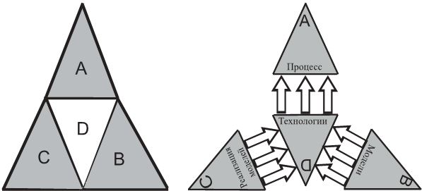 В той или иной коммуникативной ситуации реализуется та или иная конкретная модель. В приведенной на рис. 2 пирамиде сторона А обозначает процесс коммуникации во всех его проявлениях, типах, особенностях, включая коммуникаторов, их намерения, целеустановки, стратегии и тактики общения. Сторона B отражает модели или абстракции, теоретические представления о моделях коммуникативных ситуаций, типах коммуникации на основе самого широкого спектра возможных критериев, в том числе для вербальной и невербальной коммуникации, включая и коммуникации человека с человеком, человека с машиной. На грани C отображена практическая сторона процесса – реализация моделей. На основании пирамиды D размещены технологии, средства, проводники, каналы как объективно существующие объекты, наши представления о их возможностях и опыт их использования.