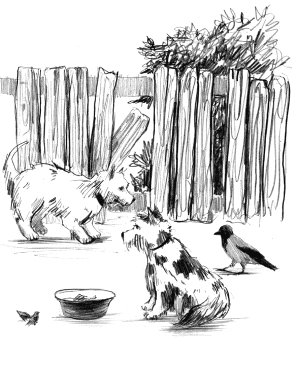 Напившись вдоволь, Друг прилёг около будки, не упуская из виду миску. Пёс уже намеревался вздремнуть, но тут появились синицы, они прилетели пособирать остатки собачьей пищи. На правах хороших знакомых расселись на конуре, поленнице и завалинке дома. Посвистывая кто о чём, подлетали и перескакивали, приближаясь всё ближе к миске.