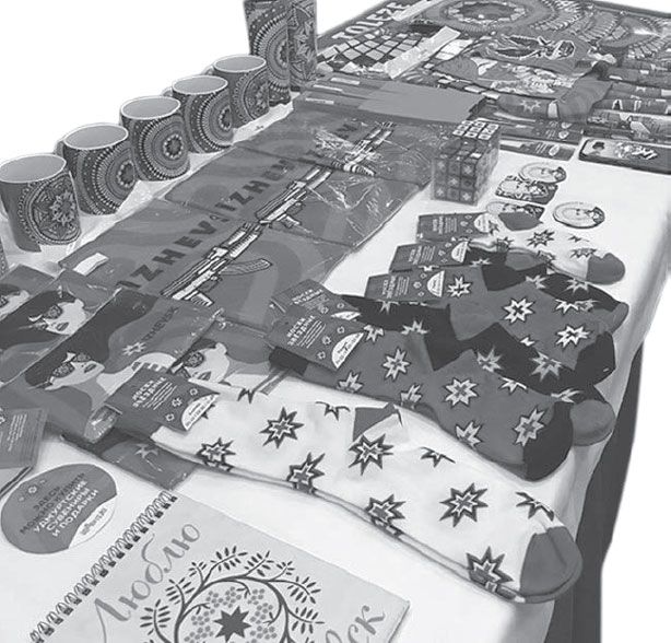 Наибольшей популярностью как среди местной молодежи, так и среди гостей региона пользуется текстильная линейка, включающая сумки, прихватки, фартуки, полотенца, скатерти, баффы (многофункциональные головные уборы – бесшовные шарфы-трубы) и носки с удмуртской символикой «Беги за чемпионом», созданные в тандеме с одной из российских фабрик.