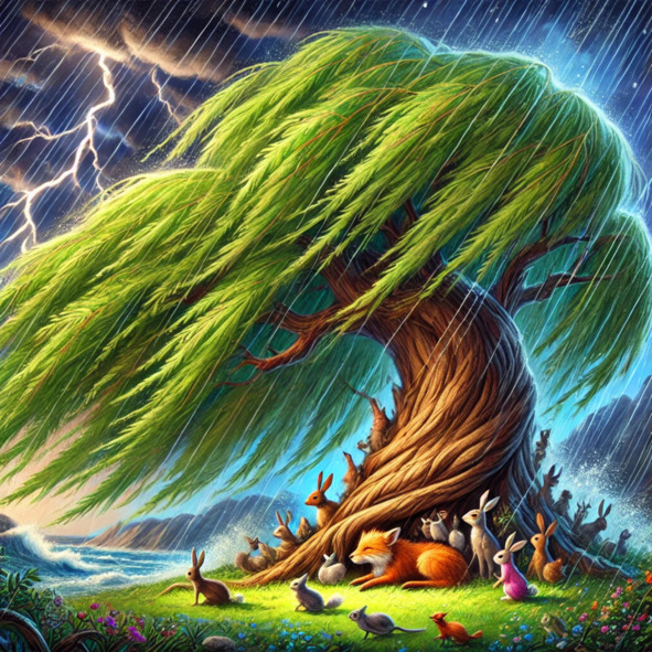 The willow, seeing the storm’s fury, called out, “Come closer, and I will protect you!”