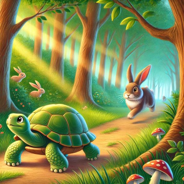 Once, in a green forest, a rabbit and a turtle argued about who was the fastest animal. The rabbit laughed loudly, “Turtle, you are so slow! You can’t even dream of beating me in a race.”