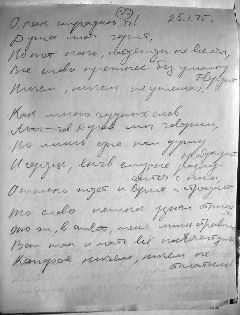 Но силы исчерпав в борьбе напрасной, Я отступился от своих исканий, Но не утратил лишь душевных я терзаний. Так вот, как утлый челн среди морских теснин С мечтой о гавани ношуся я один — Не видя берега, стремлюсь к нему опять, Но, берег увидав, не в силах я пристать.1975