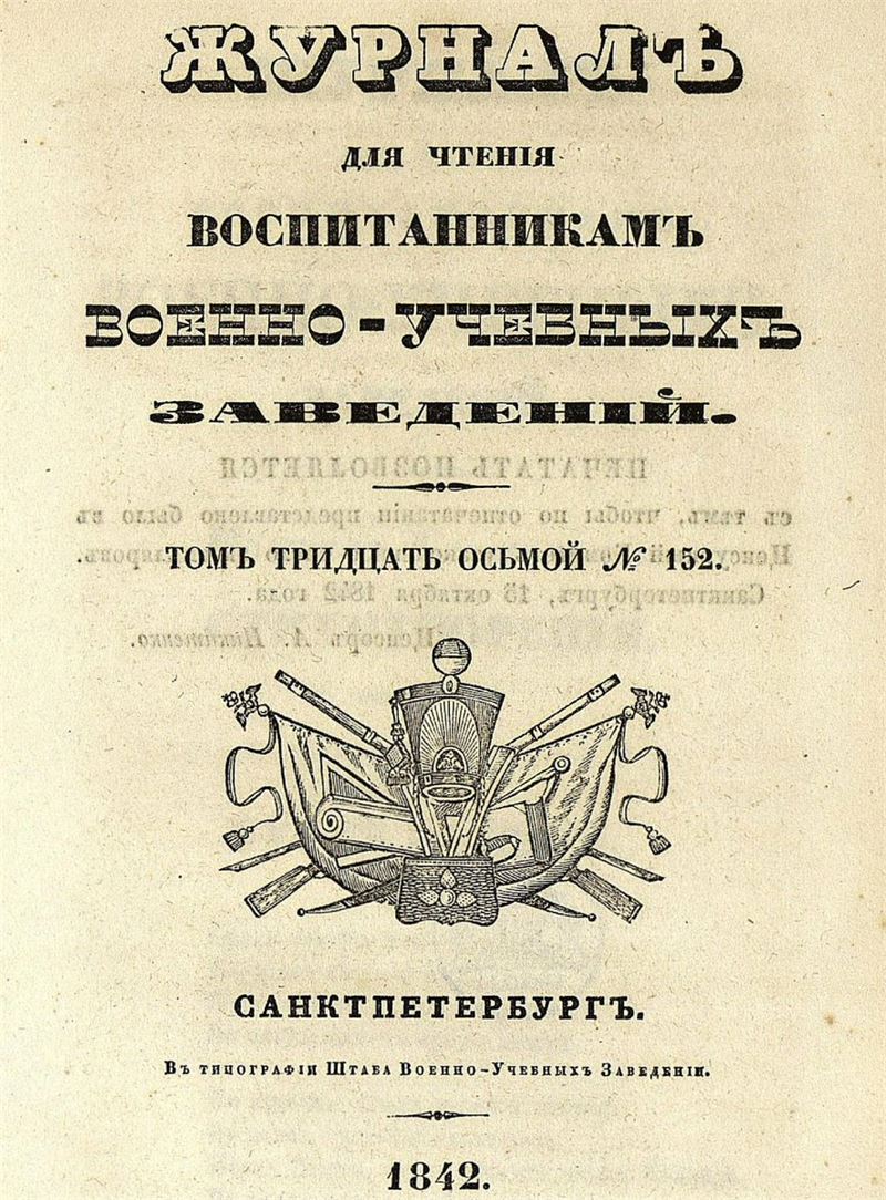 Кроме того, по команде сверху был основан и успешно до 1863 года выходил «Журнал для чтения воспитанникам военно-учебных заведений» с разделами по изящной словесности, истории, наукам, в том числе и военным. Периодическое издание, в написании статей для которого принимали участие известные писатели и общественные деятели XIX века: П.А. Плетнев, М.Н. Талызин, И.П. Шульгин, Г.П. Данилевский, А.В. Висковатов, выходило два раза в месяц, и, по мнению находящихся в теме современников, «этот скромный журнал для юношества» был «лучше десяти других литературных журналов, издаваемых для публики; статьи в нем выбраны со вкусом, с умением и представляют все вместе полезное и разнообразное чтение».