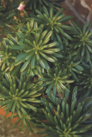 Another category that contains some interesting choices are those that are very slow-growing and evergreen. There really is little point in choosing anything deciduous: nobody wants to look at a pile of sticks in the winter if the container is in a prominent part of the garden. The Dwarf Fan Palm, Chamaerops humilis, is happy in a pot for years. So is the dwarf Pittosporum tobira ‘Nanum’. This lovely glossy-leaved plant has highly scented flowers in the summer and can be grown in a pot quite easily. Tree ferns such as Dicksonia antarctica are happy enough, too, as their root system takes years to outgrow a large pot. Hebe rakaiensis is another good choice. This plant grows to a 90cm (3ft) mound and then stops, although clipping is still advisable to keep it extra tidy. Consider a rare tree as well: Trochodendron aralioides is slow-growing, tolerant of neglect and essential for any gardener wanting to grow something really unusual.