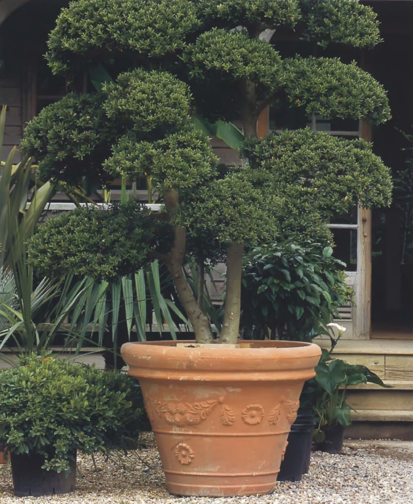 Japanese topiary such as Ilex crenata are blissfully content in large terracotta pots.