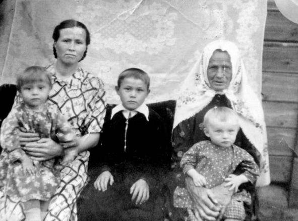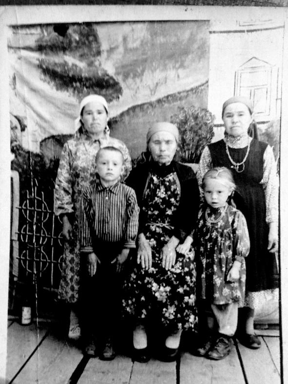 Слева направо: тётя Зубайда, я, бабушка, сестрёнка Люба, тётя Туктабей (старшая дочь бабушки)