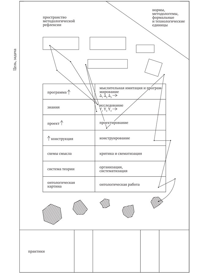 Значит, я могу пользоваться проектированием, конструированием, организацией, схематизацией… Я могу осуществлять критику предшествующих смыслов, содержаний, схематизацию этих смыслов. У меня будут появляться схемы смыслов, касающиеся мышления, поскольку это все построено для того, чтобы осуществлять работу по построению мышления. Я могу производить онтологическую работу, и у меня будет появляться онтологическая картина. Кроме того, в этом же пространстве методологической рефлексии у меня будут «плавать» предметы разного рода. И это могут быть научные предметы, проектные предметы, практико-методические предметы… Все множество разных практико-методических, научных, проектных, конструктивных и других предметов, с которыми я знаком, про которые я что-то слышал, «плавают» здесь, в этом пространстве моей рефлексии, и это означает, что я могу каждый раз залезть туда, заимствовать оттуда какие-то фрагменты теории, какие-то представления, понятия и т. д. и перетащить их в любое другое место. Но об этом я скажу особо.