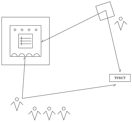 Я могу на этой схеме и с ее помощью построить процесс мышления, единственная цель которого – коммуникация, передача некоторого текста. При этом я могу отвлекаться от любых практических задач. Я могу мыслить только с одной целью – нечто вам рассказать. Я буду осуществлять на этой схеме определенный процесс мышления, выражать его в тексте. Я должен стремиться к тому, чтобы текст удовлетворял всем принципам коммуникации, чтобы он был дидактичен. И у меня может не быть никаких других целей и задач. Чистое мышление – это то мышление, которое выражается в процессе коммуникации, в тексте коммуникации и замыкается на тексте коммуникации.