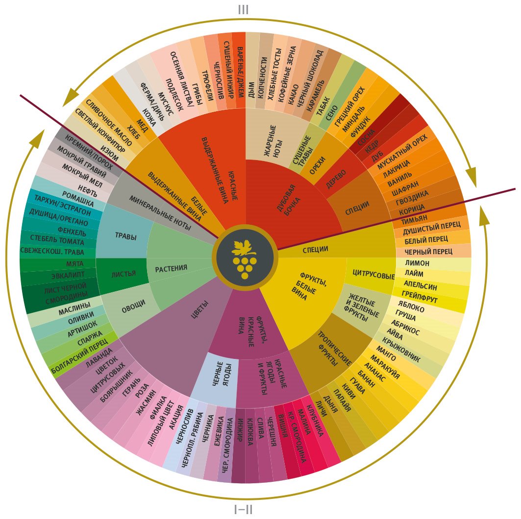 Обратите внимание, что эта последовательность отражает очередность возникновения ароматов в вине, а не в бокале. Во втором случае она связана с летучестью и легкостью ароматических молекул: сначала самые легкие и летучие, потом более тяжелые.