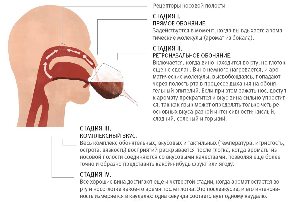 Достигнув рецепторов носовой полости, ароматическое соединение трансформируется в электрическое, передается в отдел мозга, отвечающий за распознавание ароматов, и вызывает определенный образ. Далее в процесс включаются глубинные отделы мозга: возникший образ достигает периферийной коры, записывается в память и сравнивается с уже существующими образами встречавшихся ранее ароматов. После сопоставления запахов и выявления сходства и различий, а также прохождения теста на удовольствие (приятен он или нет) аромат занимает свое место в хранилище образов. Нос улавливает ароматы на протяжении всей дегустации: до глотка, в процессе и после.
