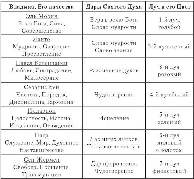 Духовные качества Вознесенных Владык и Дары Святого ДухаТаблица 4