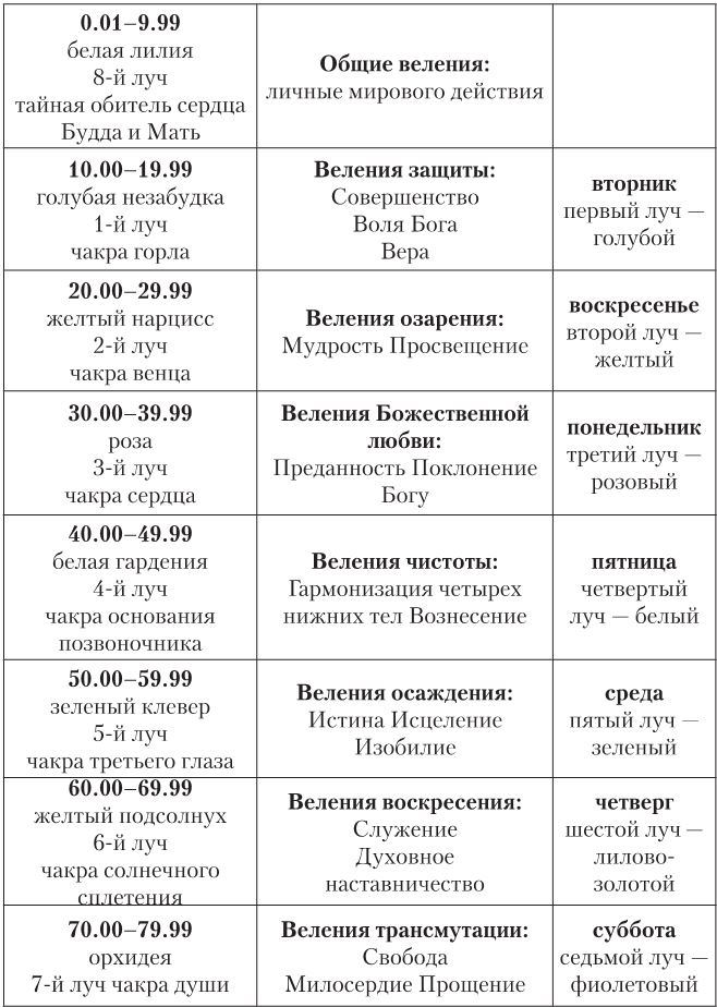 В таблице 5 приведены номера велений, соответствующие определенному дню недели и духовному лучу. Номера велений аналогичны указанным велениям в книге «Мантры, медитации и динамические веления для грядущей революции в высшем сознании»[311].