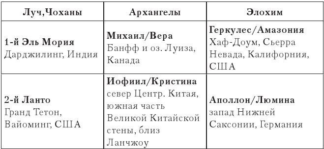 В таблице 6 приведены местонахождения эфирных Священнообителей Чоханов, Архангелов и Элохим семи основных духовных лучей.
