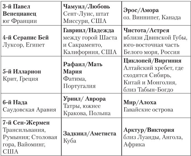Представляется необходимым знать их имена, чтобы, имея твердую убежденность, следовать их Пути. Имена Вознесенных Владык, их воплощения приведены в книге «Владыки и их обители»[322], авторами которой являются Посланники Марк Л. Профет и Элизабет Клэр Профет.
