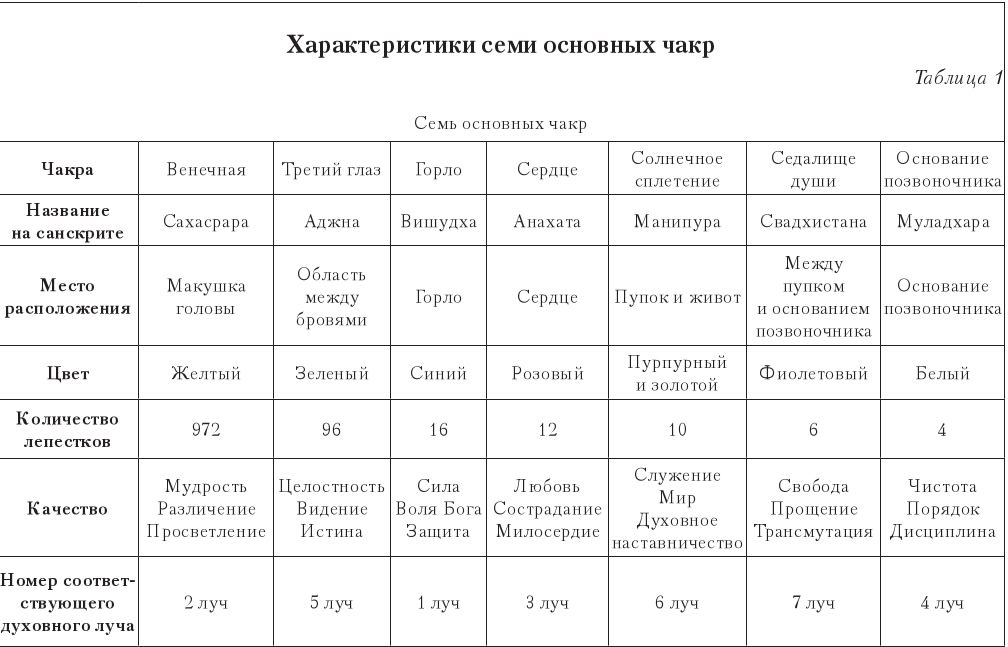 Присутствия по чакрамКак уже указывалось, духовная энергия, то есть жизненная сила Я ЕСМЬ Присутствия, по кристальной струне проходит через Святое Я Христа, где это сила понижается, а затем направляется в низшее «я», входя в тело через макушку головы. Оттуда она поступает в сеть распределительных центров и каналов, чтобы поддерживать жизнь человека в материальном мире. Наиболее важными элементами этой распределительной сети являются духовные центры низшего «я», которые называются чакрами. Чакра в переводе с санскрита означает колесо или диск. Чакры – это пульсирующие, движущиеся центры световой энергии, которые снабжают четыре нижних тела энергией, необходимой для поддержания жизни человека. Чакры находятся в эфирном теле человека. Для физического зрения они невидимы. Обычно их различают люди, обладающие ясновидением. По данным Вознесенных Владык, в эфирном теле человека насчитывается 144 чакры. Они отличаются по размеру, цвету, частоте вибраций и имеют различные функции. Назначение чакр – управлять потоком энергии, исходящим из тонких тел Высшего «Я» и текущим в ментальное, эмоциональное и физическое тела. Из всего количества чакр семь основных чакр расположены вдоль позвоночника и в области головы. Цвет каждой основной чакры соотносится с цветом одного из семи духовных лучей. Эти семь духовных лучей являются эманациями белого цвета духовной энергии бело-огненной сердцевины Я ЕСМЬ ТО, ЧТО Я ЕСМЬ Великого Центрального Солнца и нашего Я ЕСМЬ Присутствия. Проходя через призму Вселенского Христа, этот белый свет разлагается на семь духовных лучей точно так же, как луч солнца, проходя через призму, преломляется на семь цветов светового спектра, видимого глазу. Каждый из этих семи духовных лучей воплощает уникальные качества Христосознания, что находит свое отражение в цвете. Поэтому лучевая энергия, поступающая в каждую основную чакру, окрашивает чакру аналогичными компонентами: цветом, частотой вибрации, – а также передает ей качество Христосознания. Каждая чакра имеет уникальную форму, похожую на лепестки цветов. Число лепестков зависит от частоты вибрации чакры. Самый низкий уровень вибрации имеет чакра основания позвоночника. У нее четыре лепестка. Количество лепестков чакр возрастает по мере их удаления от чакры основания позвоночника по направлению к чакре венца, так как частота их вибрации увеличивается. Чакра венца имеет наивысшую частоту вибраций. У нее количество лепестков – 972. В таблице 1 приведены характеристики семи основных чакр, расположенных по порядку, начиная от макушки головы до основания позвоночника. В ней указаны названия чакр, приведенных по данным Вознесенных Владык и в соответствии с санскритским произношением. В таблице 1 представлены цвета чакр, видимых с высочайших духовных уровней, количество лепестков, примерное их расположение на физическом теле, номер соответствующего духовного луча, отражение чакрой Христо-качеств.