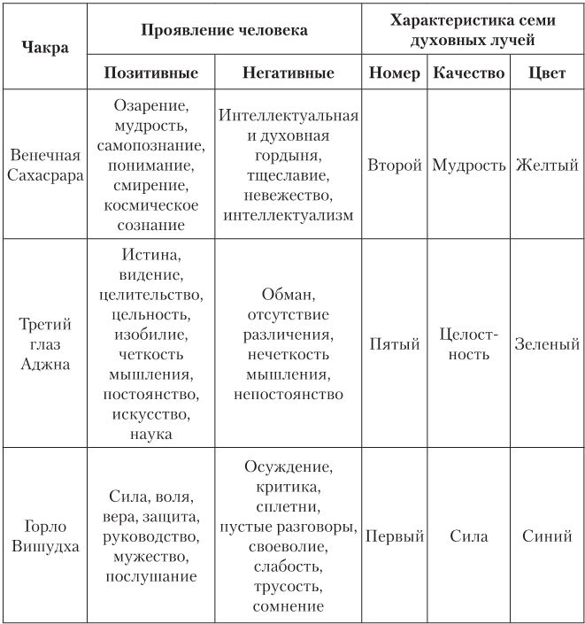 Во многих религиях является традицией формулировать причины, по которым верующим людям рекомендуется изливать или не изливать свои энергии в мир. Так, говоря о радении добродетелей, Апостол Павел рекомендует изливать «…любовь, радость, мир, долготерпение, благость, милосердие, веру, кротость, воздержания»[84]. Предостерегая от злых дел, он говорит о пороках плоти, которые «суть: прелюбодеяние, блуд, нечистота, непотребство, идолослужение, волшебство, вражда, ссоры, зависть, гнев, распри, разногласия, [соблазны,] ереси, ненависть, убийства, пьянство и тому подобное. Предваряю вас… что поступающие так Царства Божия не наследуют»[85]. Подобные рекомендации по предотвращению грехов, содеянных людьми, изложены в Заповедях, дарованных Господом Богом пророку Моисею[86]. Аналогичные пророчества даны Иисусом Христом в Нагорной проповеди[87], [88]. Подобные наставления сформулированы Гаутамой Буддой в четырех благородных истинах и восьмеричном пути[89], а также они изложены в Торе иудеев и Коране мусульман. В таблице 2 представлены позитивные и негативные проявления человеком и их связь с чакрами, а также связь с семью духовными лучами и качествами этих лучей.