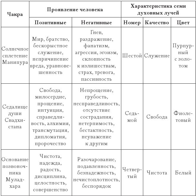 Позитивные и негативные проявления человека и их связи с чакрами и семью духовными лучамиТаблица 2