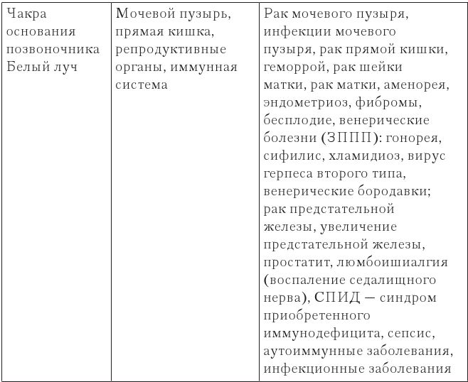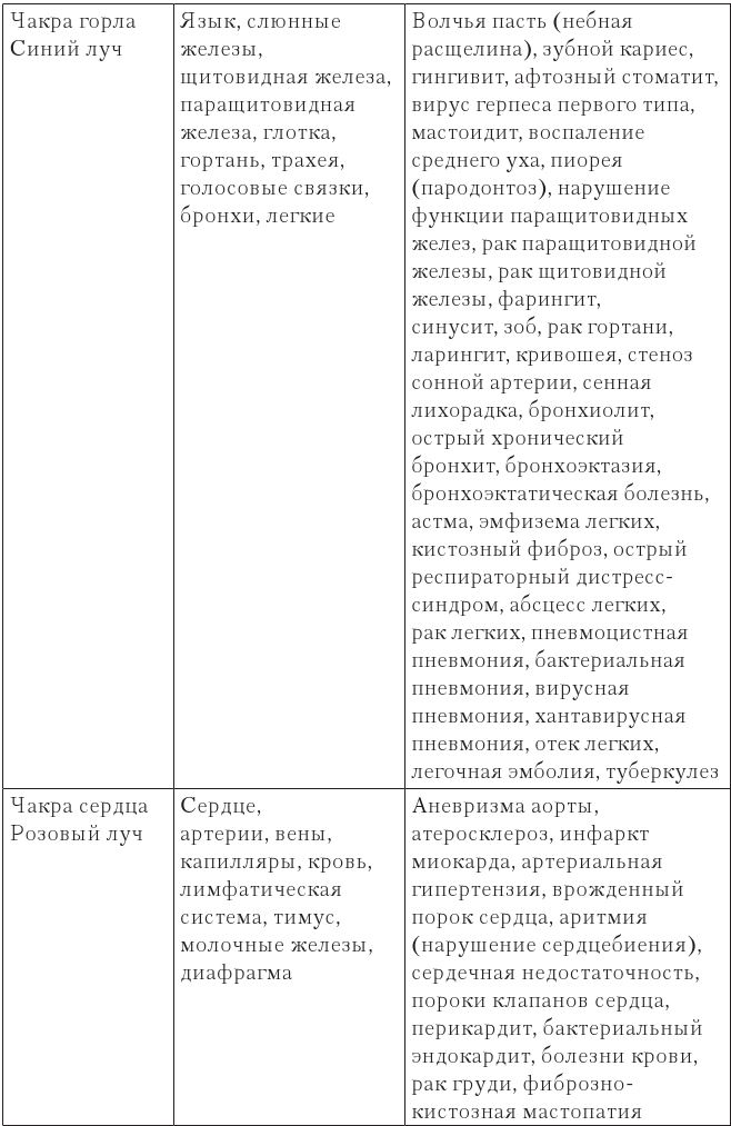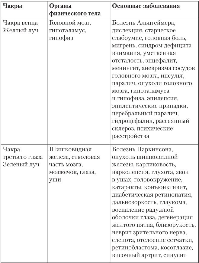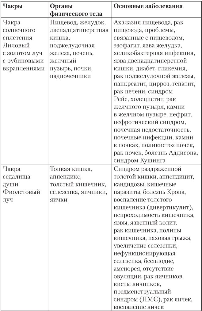 В таблице 3 представлены чакры и органы физического тела, связанные с чакрами, а также основные заболевания этих органов. Данные, указанные в таблице 3, основаны на материалах лекции Посланника Элизабет Клэр Профет[105]. Эти данные позволят людям, занимающимся духовным целительством, помочь в целенаправленном выборе духовного метода лечения болезни.