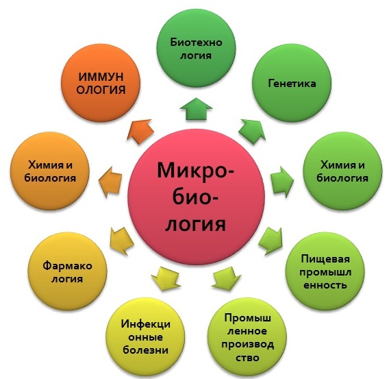 Например, микробиология чрезвычайно тесно связана со множеством наук и сфер деятельности человека: не только с фундаментальными химией и биологией, но также с генетикой, фармакологией, клинической медициной, химической и пищевой промышленностью, обеззараживанием сточных вод и даже производством материалов для электроники.