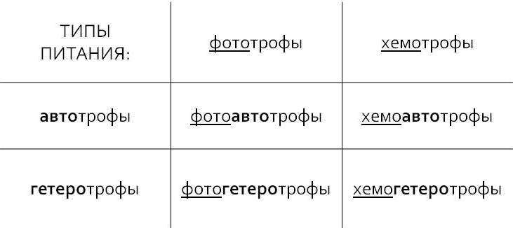 Итак, имея две группы по два раздела в каждой, мы можем получить 2*2=4 типа живых существ (4 типа питания):