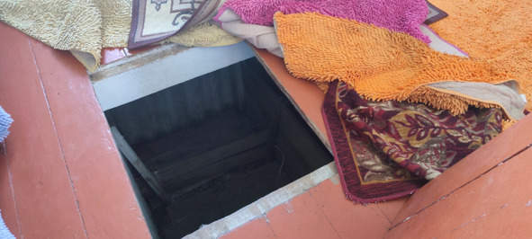 Таня быстро сгребла в сторону разноцветные бабушкины половички, открыла крышку люка подпола, спустилась вниз, постелила коврики, разложила подушки, одеяла, вылезла наверх.