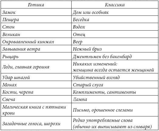 В начале XIX века романы ужасов выходили пачками, «способы пугать» были сочтены и пронумерованы, ужас превратился в товар, скроенный по готовым лекалам. В середине XX века исследователь готических романов Монтегю Саммерс даже опубликовал полушуточную таблицу, в которой можно было легко проследить смену эстетики от «классики» к «готике».