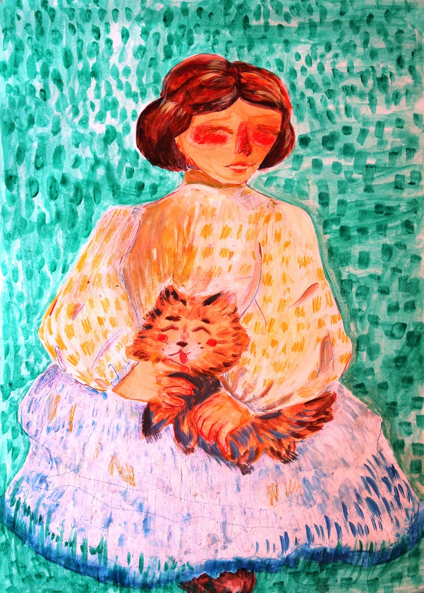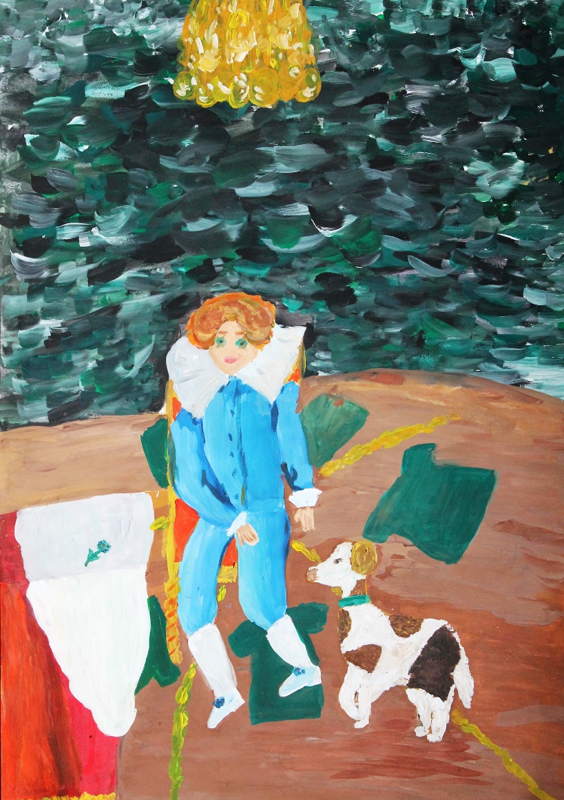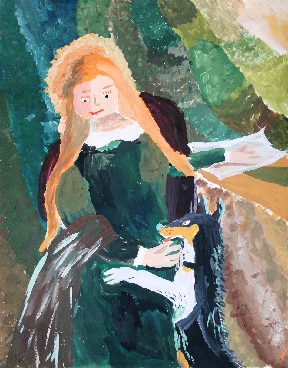 Девушка в темном, как бархат платье со светящимися рыжими волосами сидела в кресле и увлечённо читала письмо. Вдруг в комнату вбежала собака: чёрная спинка, рыжие бока и белое пузико. Девушка и собака были так похожи друг на друга, что всем было ясно – они самые лучшие друзья. Девушка отложила письмо и радостно стала трепать свою собаку. «Что-то я сегодня засиделась. Не пора ли, друг, прогуляться нам с тобою по прекрасному осеннему саду, поиграть с разноцветной листвой» – сказала девушка. «Гав!» – ответил радостно пёс.