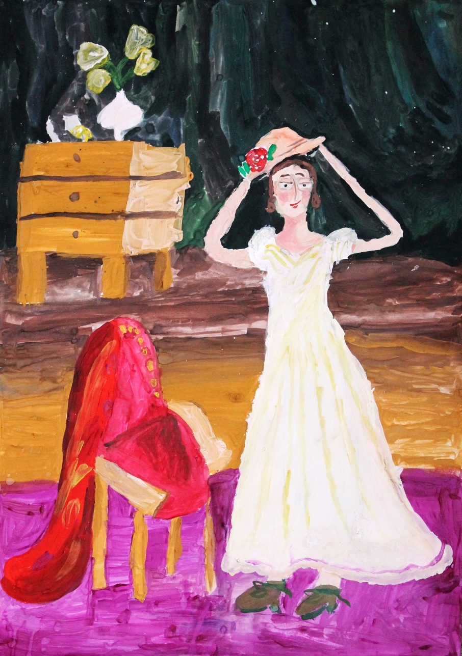 Татьяна прогуливалась по цветущему саду и собирала цветы. В руках у неё была великолепная шляпка. Шляпка была самым любимым подарком от папы. Он привёз её из самой Франции, как раз на именины. Зайдя в дом, она встала перед зеркалом и увлечённо начала примерять свой подарок. Так долго Татьяна была занята своей шляпкой, что все уже устали её ждать к обеду. «Почему, ты опоздала на обед?» – удивлённо спросил папа. «Всё дело в шляпе!» – ответила мило девушка.