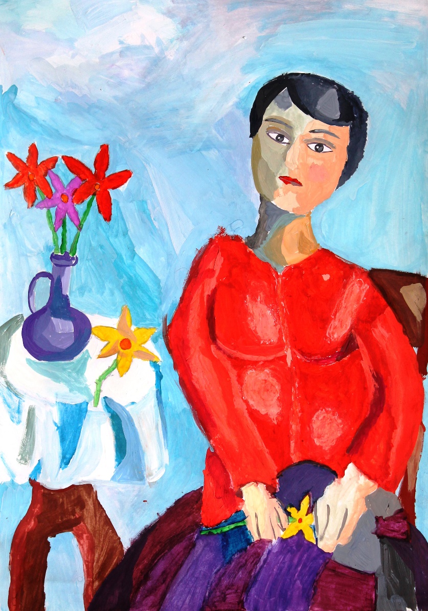 Молодая женщина каждый день следит за тем, чтобы в доме стояли свежие цветы. Она присела для того, чтобы полюбоваться их нежностью и красотой. Девушка любит цветы, она прекрасно знает, что они дают человеку не только красоту, но ещё и дружат с ним, помогают ему: врачуют, скрашивают тяжёлые минуты, предсказывают погоду… Посмотрите на эти милые нарциссы! Их присутствие наполнило комнату нежным голубоватым светом и сладким ароматом. Словно цветок расцвела и сама молодая женщина!