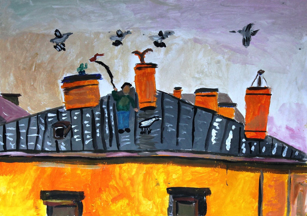 Прошёл дождь! На улице свежо и тепло, можно приступать к работе. Трубочист вышел чистить трубы, но нужно быть осторожным: мокрая крыша – скользкая крыша! А тут ещё ото всюду набежали коты. Что же могло их привлечь на крыше? Трубочист огляделся и понял: на мокрой крыше сверкали то тут, то там солнечные зайчики и отражались яркие блики неба!
