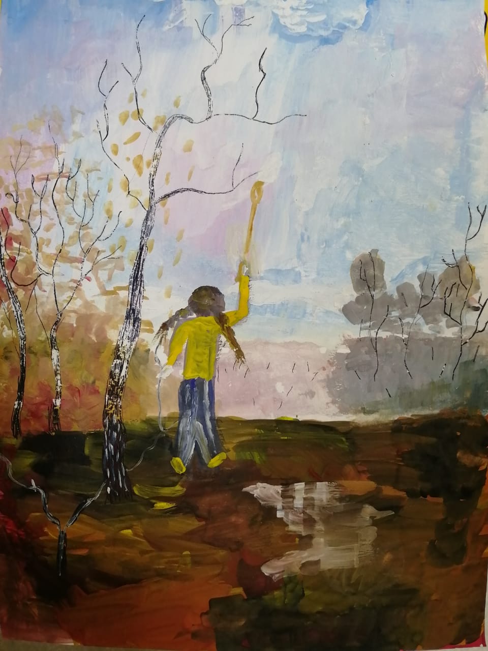 Картина Е.Е. Волкова «В лесу по весне» напомнила мне о прогулке в лесу, где росли точно такие деревья. Но в этом пасмурном небе мне показалось, что не хватает светлого облачка. Поэтому я изобразила себя с кисточкой, чтобы добавить кудрявое облако.