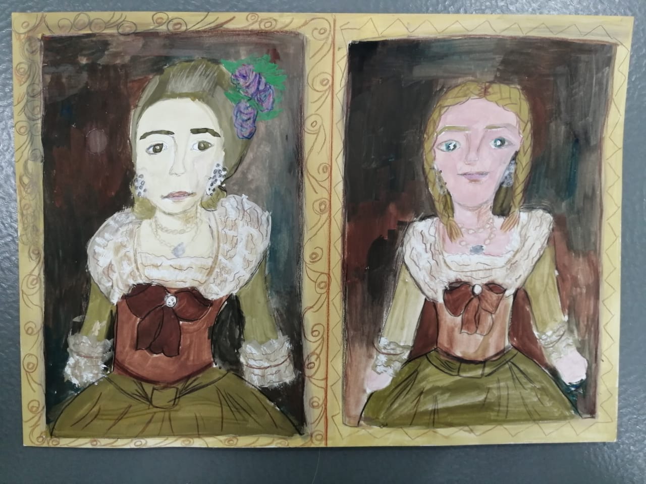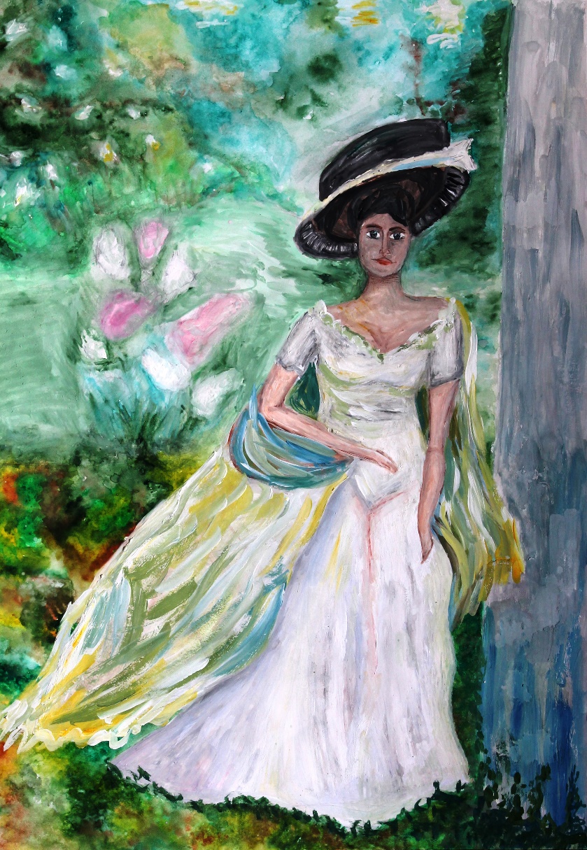Смотрит дама на меня и думает, почему я одета не так как она, и выгляжу по-другому. Тогда я решила изобразить себя точно в таком же платье, чтобы ей не было скучно. Я представила, как на следущий год я приглашу эту «Девочку» – даму к нам на новогодний карнавал. Я думаю, ей будет интересно попасть из восемнадцатого века в двадцать первый.