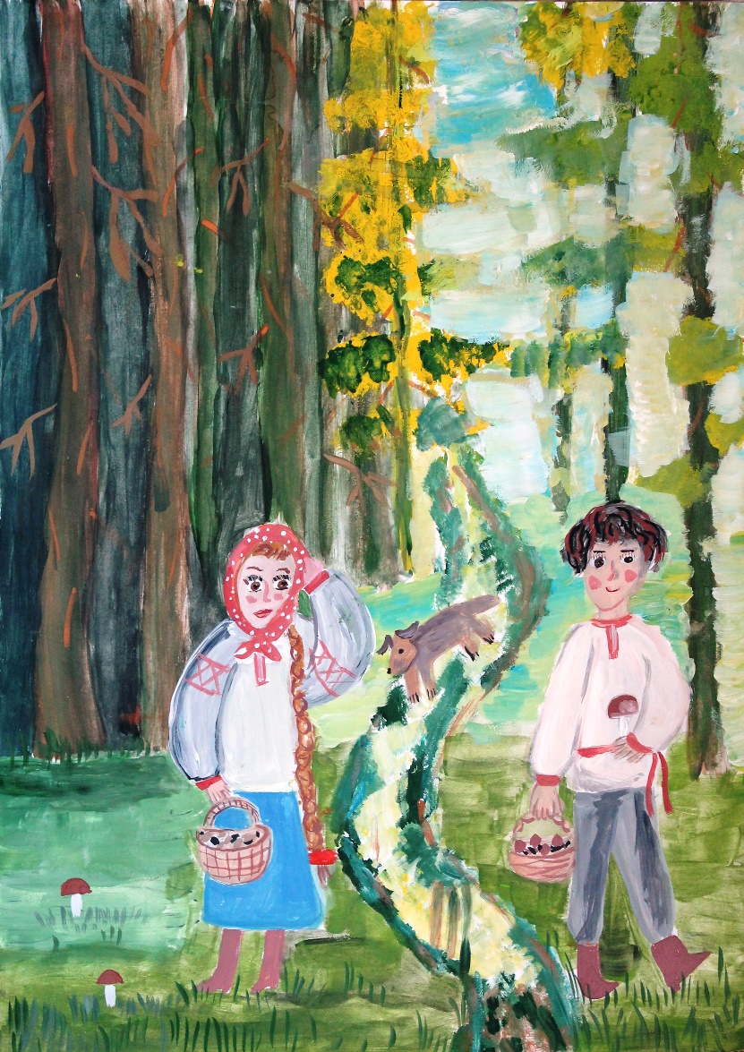 Осень. Дни стояли теплыми, но дождливыми. В народе такие дожди прозвали грибными. Рядом с деревней сосновый лес, а там грибов видимо-невидимо. А после грибного дождя их ещё больше выросло. Вот сестрица Алёнушка и братец Иванушка отправились в бор за грибами. Целый день бродили они по дубраве и к вечеру набрали полные корзины благородных белых грибов. Вышли они из леса уставшими, но счастливыми, как родители обрадуются таким королевским грибам!