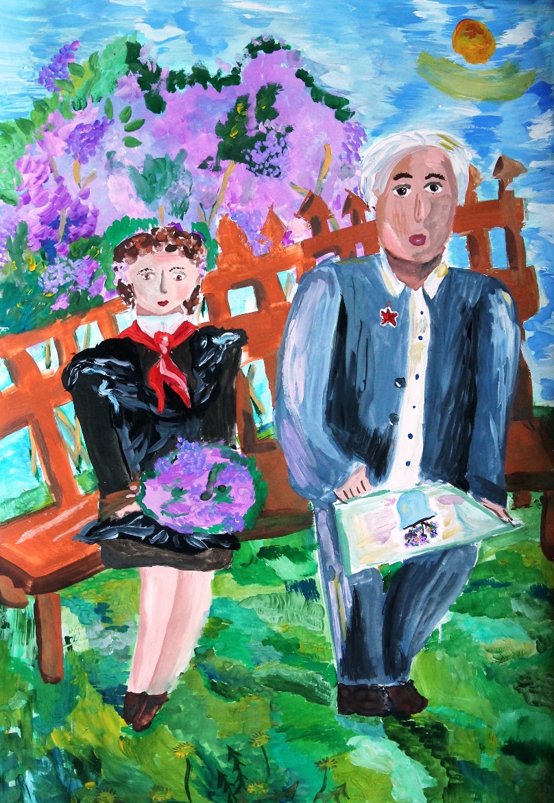 Сегодня в такой прекрасный весенний день Марина очень торопилась закончить свой рисунок, не потому, что на улице светило солнце и можно было погулять с девочками во дворе, а потому что она хотела поскорей подарить рисунок дедушке Георгию Анатольевичу. Георгий Анатольевич жил рядом со школой, был соседом Марины, а главное, он был ветераном Великой Отечественной войны. Десять лет прошло со дня Великой Победы! За эти десять лет построили школу, родилась и выросла Марина, кусты сирени окрепли, и всё вокруг было хорошо и спокойно.