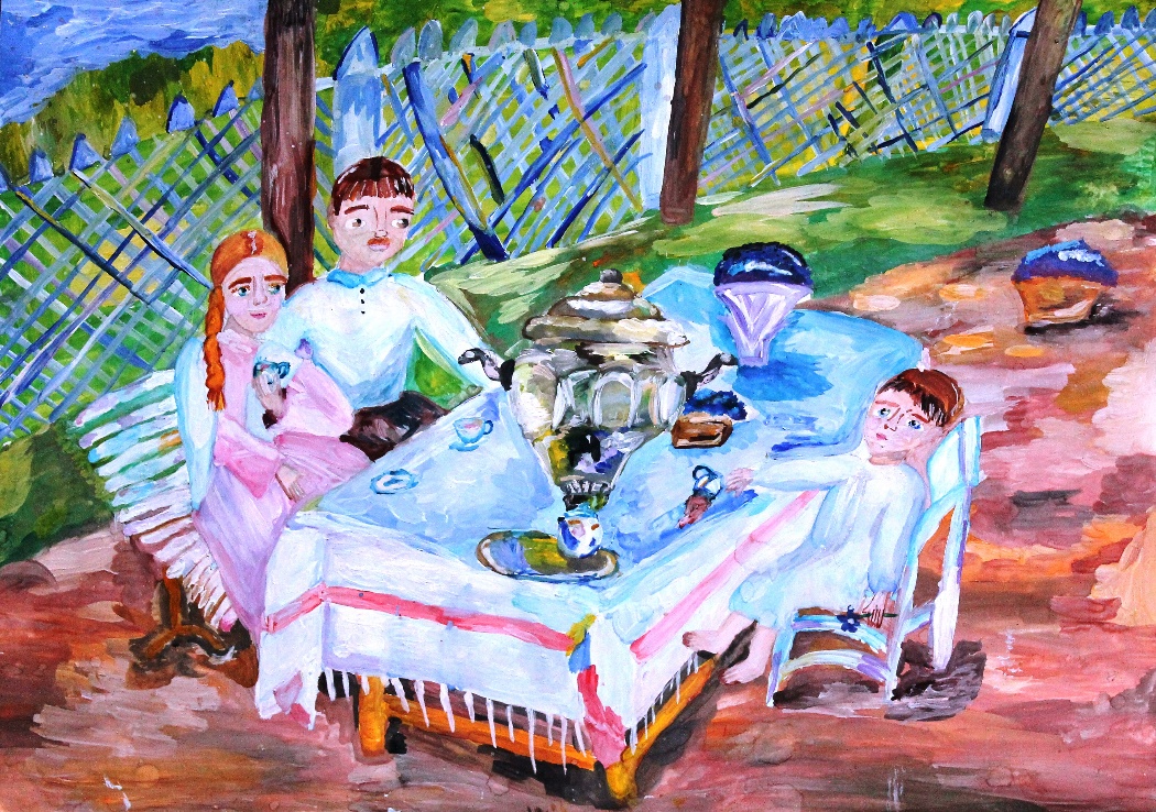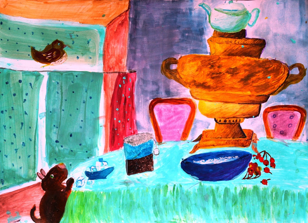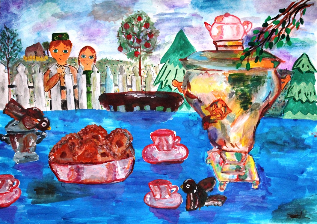 Ласковое летнее утро! На белоснежной скатерти расположился, как важный господин Самовар. Вокруг стояли нежно белые фарфоровые чашки и яркие, синие-синие васильки. За утренний чай сели папа, мама и их маленький сын. Чай из самовара был вкусным, ароматным и он особенно понравился малышу. Он случайно пролил чай на белую скатерть и испачкал её, но родители не ругали сына, а просто налили ему ещё одну чашечку чая. «За чаем не скучаем – по семь чашек выпиваем!» – сказал отец, и все улыбнулись, улыбнулись и васильки!